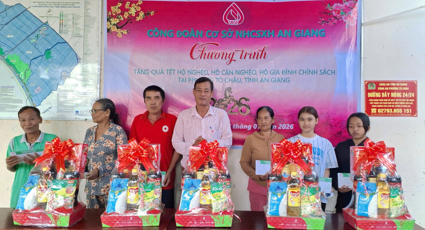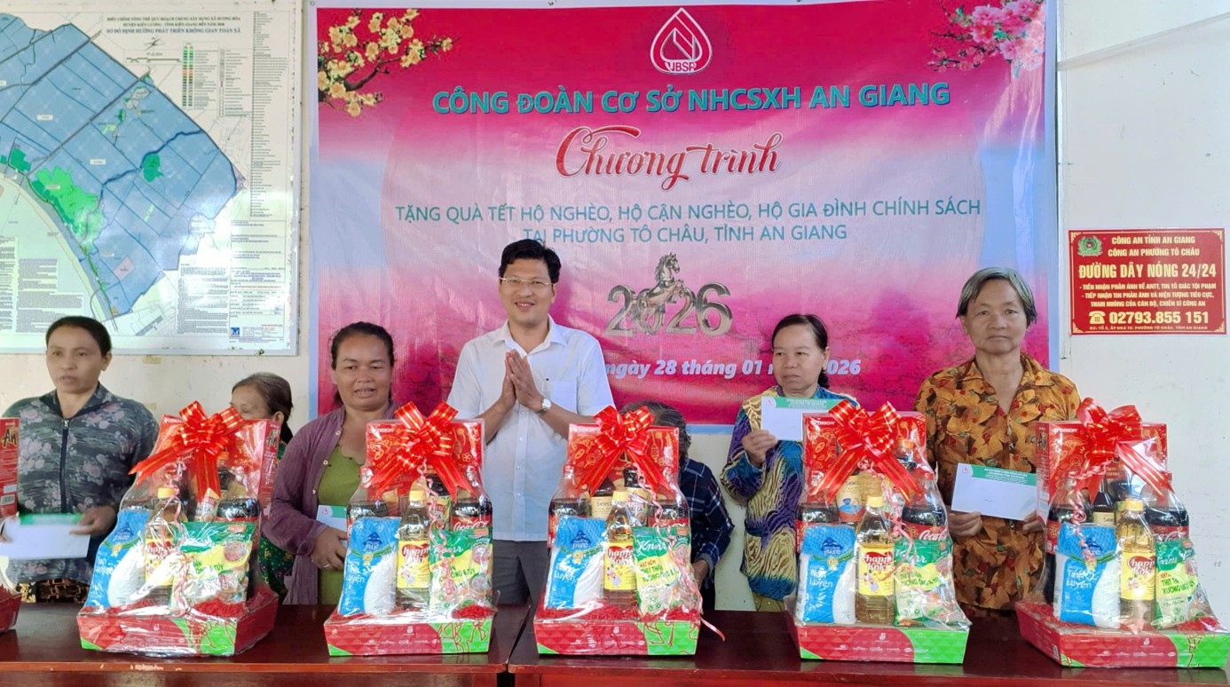 Thực hiện chủ trương của Đảng và Nhà nước về chăm lo đời sống nhân dân, đặc biệt là các đối tượng yếu thế trong xã hội mỗi dịp Tết đến, Xuân về; căn cứ Công văn số 02/CV-CĐCS ngày 14/01/2026 của Chủ tịch Công đoàn cơ sở (CĐCS) Ngân hàng Chính sách xã hội (NHCSXH) tỉnh An Giang về việc tổ chức chương trình “Tặng quà Tết hộ nghèo, hộ cận nghèo, hộ gia đình chính sách” nhân dịp Tết Nguyên đán Xuân Bính Ngọ năm 2026, sáng ngày 28/01/2026, tại Trụ sở ấp Ngã Tư – Dương Hòa, phường Tô Châu, tỉnh An Giang, CĐCS NHCSXH tỉnh An Giang đã phối hợp cùng Ủy ban nhân dân phường Tô Châu tổ chức trao quà Tết cho các hộ nghèo trên địa bàn.