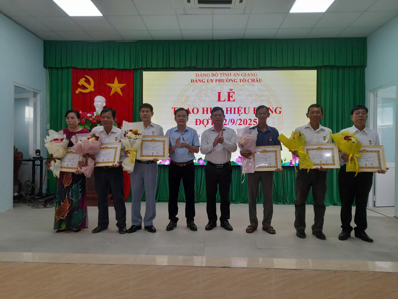 Theo đó, Ban Thường vụ Đảng ủy phường Tô Châu trao huy hiệu 30 năm tuổi đảng cho 07 đảng viên gồm các đồng chí: Huỳnh Trung Kiên; Đoàn Bé sáu; Bùi Văn Định; Trần Văn Lâm; Huỳnh Thị Khắp; Phạm Ngọc Thanh và Nguyễn Văn Út; 03 đồng chí 40 tuổi đảng gồm Nguyễn Văn Út, Nguyễn Văn Hùng, Võ Văn Hùng và đồng chí Huỳnh Văn Công 45 năm tuổi đảng.