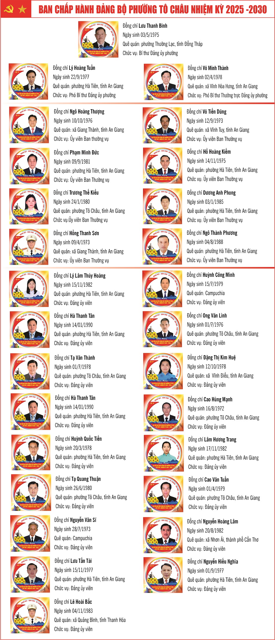 aA Đảng ủy xã Danh sách Ban chấp hành Đảng bộ phường Tô Châu, nhiệm kỳ 2025-2030 07/11/2025, 09:28 Quay về Chia sẻ Copy link thành công Tin khác /danh-sach-ban-chap-hanh-dang-bo-phuong-chau-nhiem-ky-2025-2030