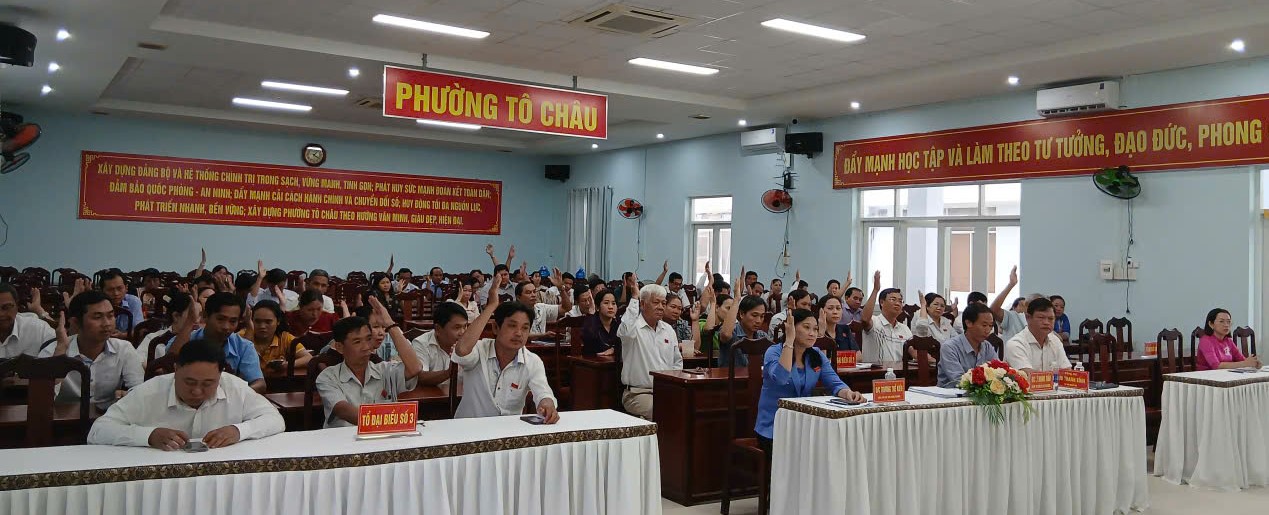 HĐND phường Tô Châu (tỉnh An Giang) tổ chức kỳ họp thứ ba (kỳ họp chuyên đề). Tại cuộc họp, đại biểu HĐND phường biểu quyết thông qua 3 nghị quyết thuộc thẩm quyền. Đại biểu HĐND phường Tô Châu biểu quyết thông qua các nghị quyết về biên chế cán bộ, công chức trong các cơ quan của chính quyền địa phương; số lượng người làm việc hưởng lương từ ngân sách nhà nước trong đơn vị sự nghiệp công lập của phường Tô Châu; Điều chỉnh, bổ sung kế hoạch đầu tư công trung hạn giai đoạn 2021-2025 trên địa bàn phường Tô Châu; Điều chỉnh, bổ sung kế hoạch đầu tư công năm 2025 trên địa bàn phường Tô Châu.