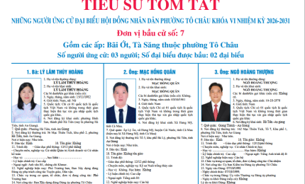 aA Hội đồng nhân dân Tiểu sử tóm tắt đại biểu ứng cử HĐND phường Tô Châu - Đơn vị bầu cử số 3 03/03/2026, 14:38 Tập tin chau-07dv03.pdf (610.72 KB) Quay về Chia sẻ Copy link thành công Tin khác Hội đồng nhân dân phường Tô Châu tổ chức Kỳ họp thứ hai (Kỳ họp chuyên đề) Hội đồng nhân dân Hội đồng nhân dân xã 02/04/2026 Kỳ họp thứ nhất Hội đồng nhân dân phường Tô Châu khóa VI, nhiệm kỳ 2026-2031 bầu các chức danh thường trực HĐND, UBND phường Hội đồng nhân dân Hội đồng nhân dân xã 26/03/2026 Nghị quyết số 05/NQ-UBBC ngày 18/3/2026 về việc công bố kết quả bầu cử và danh sách những người trúng cử đại biểu HĐND phường Tô Châu Hội đồng nhân dân 19/03/2026 Tiểu sử tóm tắt đại biểu ứng cử HĐND phường Tô Châu - Đơn vị bầu cử số 7 Hội đồng nhân dân 03/03/2026 Tiểu sử tóm tắt đại biểu ứng cử HĐND phường Tô Châu - Đơn vị bầu cử số 6 Hội đồng nhân dân 03/03/2026 Tiểu sử tóm tắt đại biểu ứng cử HĐND phường Tô Châu - Đơn vị bầu cử số 5 Hội đồng nhân dân 03/03/2026 Tiểu sử tóm tắt đại biểu ứng cử HĐND phường Tô Châu - Đơn vị bầu cử số 4 Hội đồng nhân dân 03/03/2026 Tiểu sử tóm tắt đại biểu ứng cử HĐND phường Tô Châu - Đơn vị bầu cử số 2 Hội đồng nhân dân 03/03/2026 Tiểu sử tóm tắt đại biểu ứng cử HĐND phường Tô Châu - Đơn vị bầu cử số 1 Hội đồng nhân dân 03/03/2026 Từ lá phiếu đến Hiệu quả quản trị quốc gia: Ý nghĩa của bầu cử năm 2026 Hội đồng nhân dân 02/03/2026 /tieu-su-tom-tat-dai-bieu-ung-cu-hdnd-phuong-chau-don-vi-bau-cu-so-3
