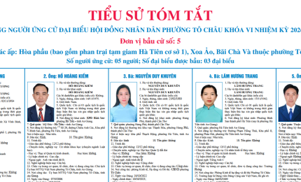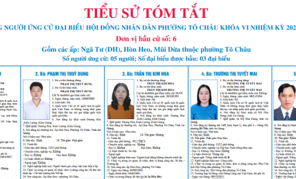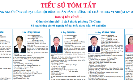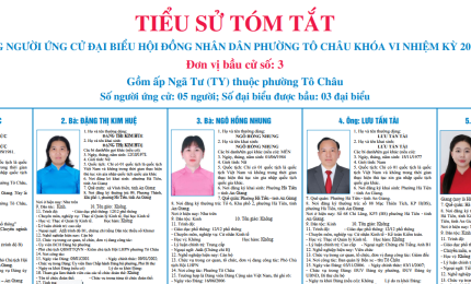aA Hội đồng nhân dân Tiểu sử tóm tắt đại biểu ứng cử HĐND phường Tô Châu - Đơn vị bầu cử số 7 03/03/2026, 14:49 Tập tin chau-07dv07.pdf (406.35 KB) Quay về Chia sẻ Copy link thành công Tin khác Hội đồng nhân dân phường Tô Châu tổ chức Kỳ họp thứ hai (Kỳ họp chuyên đề) Hội đồng nhân dân Hội đồng nhân dân xã 02/04/2026 Kỳ họp thứ nhất Hội đồng nhân dân phường Tô Châu khóa VI, nhiệm kỳ 2026-2031 bầu các chức danh thường trực HĐND, UBND phường Hội đồng nhân dân Hội đồng nhân dân xã 26/03/2026 Nghị quyết số 05/NQ-UBBC ngày 18/3/2026 về việc công bố kết quả bầu cử và danh sách những người trúng cử đại biểu HĐND phường Tô Châu Hội đồng nhân dân 19/03/2026 Tiểu sử tóm tắt đại biểu ứng cử HĐND phường Tô Châu - Đơn vị bầu cử số 6 Hội đồng nhân dân 03/03/2026 Tiểu sử tóm tắt đại biểu ứng cử HĐND phường Tô Châu - Đơn vị bầu cử số 5 Hội đồng nhân dân 03/03/2026 Tiểu sử tóm tắt đại biểu ứng cử HĐND phường Tô Châu - Đơn vị bầu cử số 4 Hội đồng nhân dân 03/03/2026 Tiểu sử tóm tắt đại biểu ứng cử HĐND phường Tô Châu - Đơn vị bầu cử số 3 Hội đồng nhân dân 03/03/2026 Tiểu sử tóm tắt đại biểu ứng cử HĐND phường Tô Châu - Đơn vị bầu cử số 2 Hội đồng nhân dân 03/03/2026 Tiểu sử tóm tắt đại biểu ứng cử HĐND phường Tô Châu - Đơn vị bầu cử số 1 Hội đồng nhân dân 03/03/2026 Từ lá phiếu đến Hiệu quả quản trị quốc gia: Ý nghĩa của bầu cử năm 2026 Hội đồng nhân dân 02/03/2026 /tieu-su-tom-tat-dai-bieu-ung-cu-hdnd-phuong-chau-don-vi-bau-cu-so-7